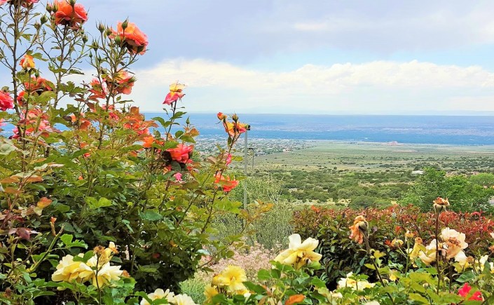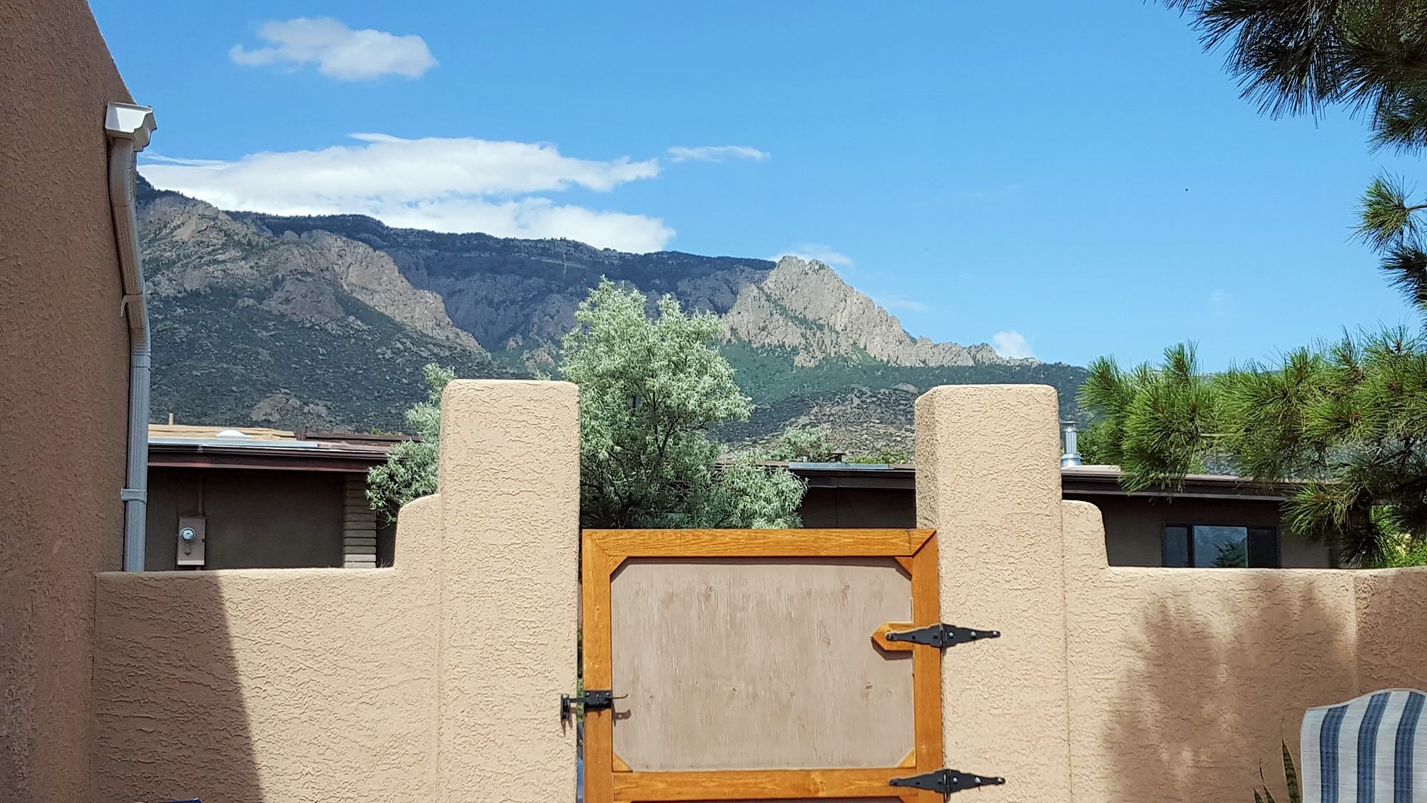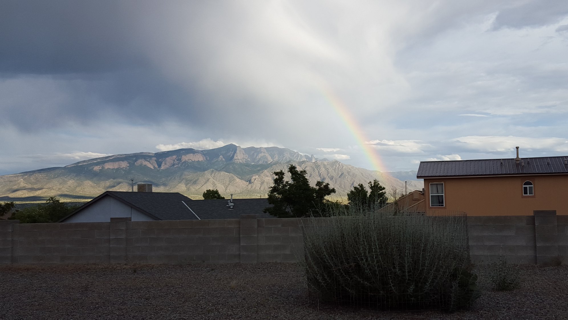 Albuquerque is such a beautiful city. It is situated in a Valley with the Sandia Mountains bordering on the east side. The scenery, no matter where you drive is just breathtaking. On Sunday before I left Gino and I went to Sam and Melissa’s house. Sam is my step brother, Gino,s half brother. He lives in Bernalillo, which is north of Albuquerque. Gino wanted to do some drinking, lol, so he invited his friend Anthony to drive us. They all grew up together and attended the same schools. So we took off down the freeway and then headed north in the valley shadowing the mountains on the right. When we got to Bernalillo, we turned west and climbed out of the valley somewhat. Sams house was located in a development that was overlooking the town. When we arrived Sam was doing dishes….lol…..The boys were home, both grown now, Sammy G and Issac. Melissa was outside with her parents from Santa Fe. I had met them one other time. Sam made steaks on the grill and we had a great meal. As we looked out across their back yard I seen….. “THE RAINBOW” …..In the sky was a dark rain cloud hovering and moving slowly up the valley between us and the mountains. The rainbow appeared as we watched. I can’t imagine sitting in my back yard every day and watching such gorgeous views before me. We continued to watch it as it slowly headed north up the valley and the rainbow disappeared. You could just see the rays of the sun playing on the mountains across from us and casting shadows. A view always changing.