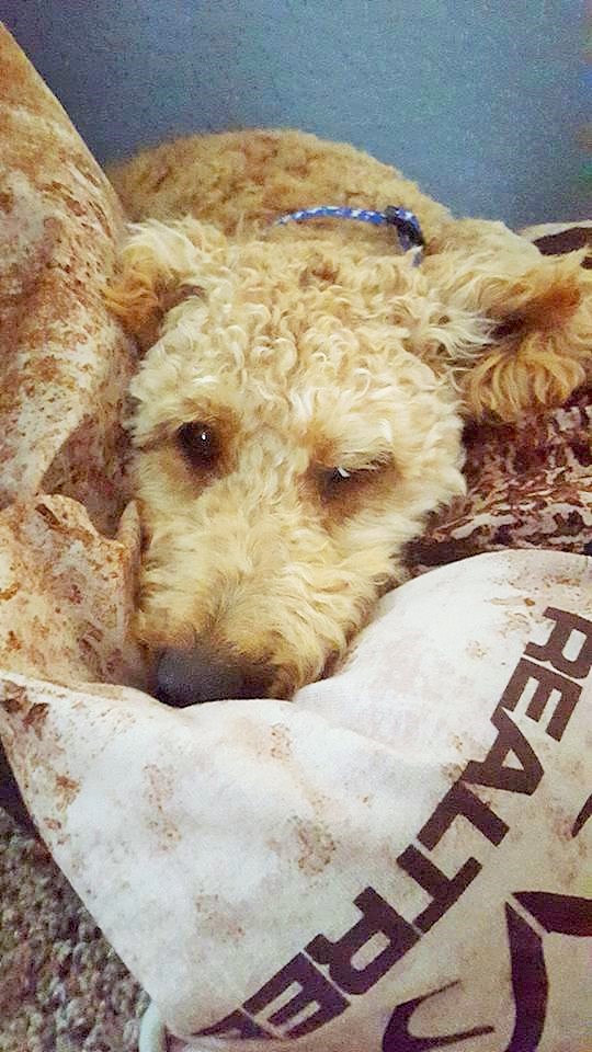 He is a Golden Doodle and is only 5 months old. OMG….What a baby…and now a chewer…..He is locked up in the kitchen when no one is home. They have gates everywhere leading out of the kitchen. He also has a soft doggy pillow that he lays on in the kitchen.