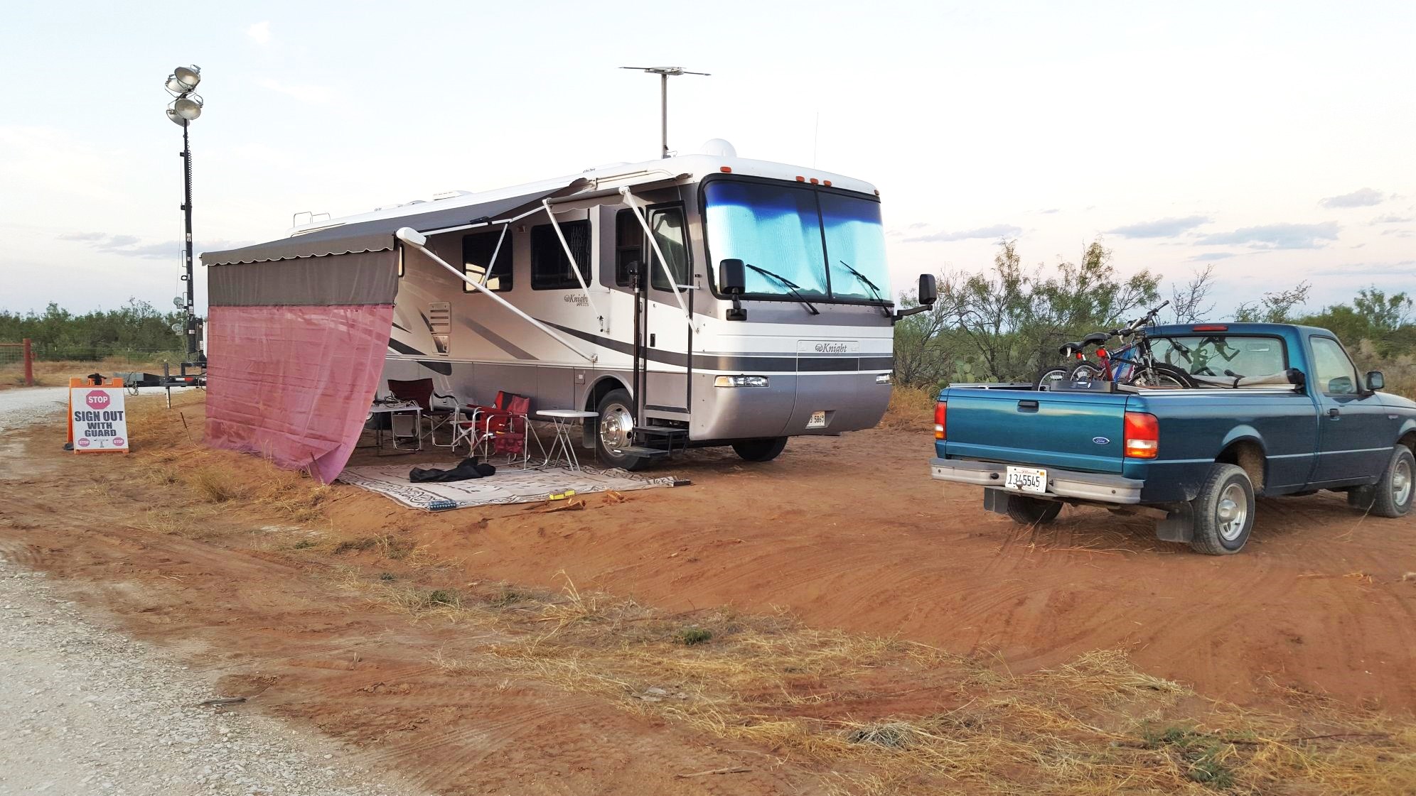 There was no traffic yet, so Rich started setting up as Chris gave me all the details and went over the log sheets with us. So easy. Then Chris moved our generator with the light pole attached over to our rig. The gasoline tank is behind it as we have to make sure the generator is filled. Then Rich hooked up the RV and got our electric and AC running. Later that day the guy came a delivered our 200 gallon septic tank…..So we are all Good…