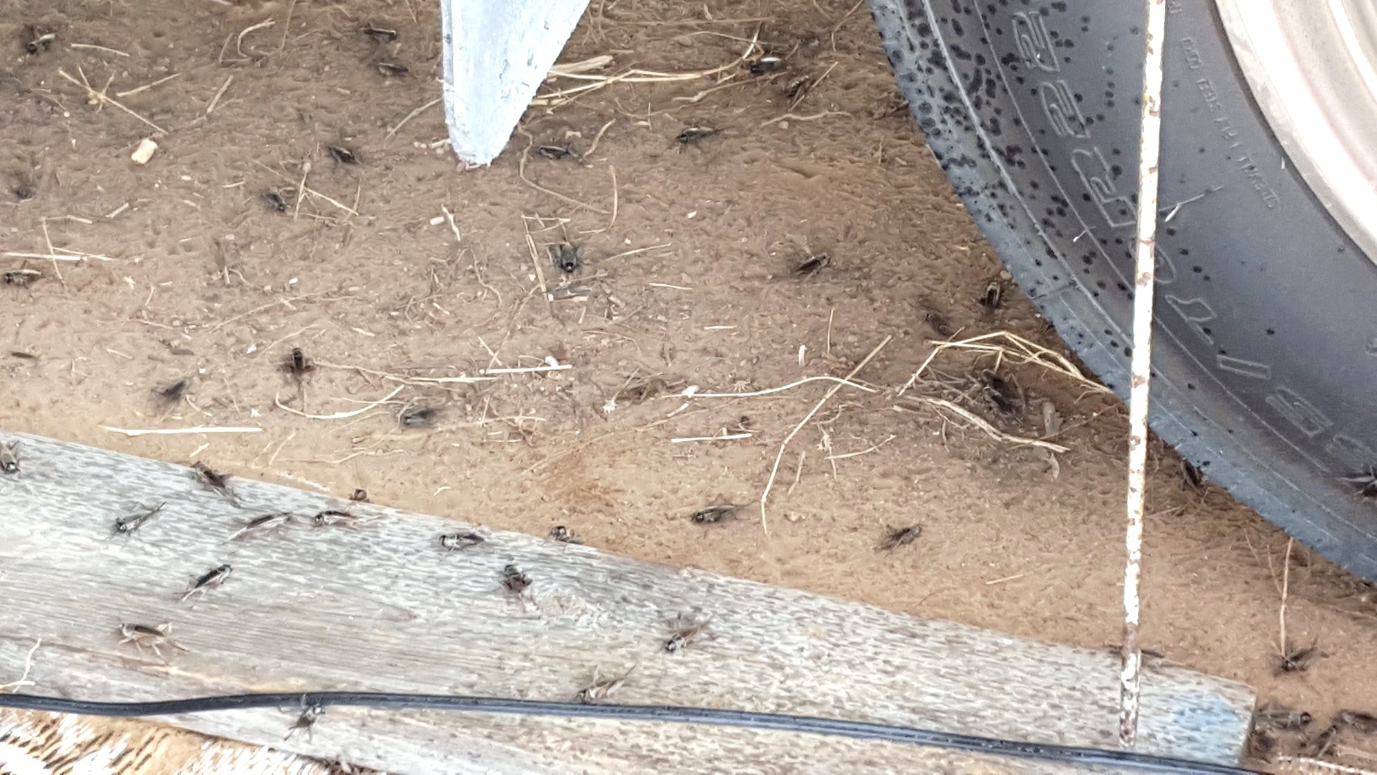 More Crickets…….Horrible Horrible…..the smell was getting so bad. They were everywhere…..Piles under the wheels. So Rich got out the Raid and sprayed the screen. Then we pulled our patio rug out the the road and sweeped and dumped all the crickets.