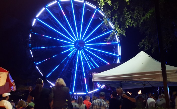We knew they were putting new LED lighting on the Big Wheel.  Last Thursday, Rich looked out the window towards the park and he said, Look the Big Wheel lights are on.  We sat their and watched in delight, and then drove the golf cart to the parking lot.  I took pics and a video.  It was so beautiful.  The colors changed, moved in a wheel, moved in swirls…..It was so pretty.  They ran all evening till 10pm and again Friday nite.  Finally Saturday came.  We arrived at 10:15 am to turn in our uniforms for the year.  I was in Games again and was assigned Alpine which would be up by the main stage….This is just where I wanted to be.  Right in the middle of the action.  Now Rich was assigned to the Tilt a Whirl. He would be near the back of the park and probably wouldn’t see as much action.  This year they would be having 13 bands on 7 different stages through out the park at different times.  Wow.  It was a rather cool morning to start, so I wore jeans.  It was going to be a casual affair for us in Games as many of our rules were relaxed.  We could buy from the many food vendors in the park, and their were many (although Rich had to eat in the commissary, strange, it was a rule for Rides. ).  We were also allowed to take our phones.  Soooo pictures….YES…..So the gates opened at 11 am.