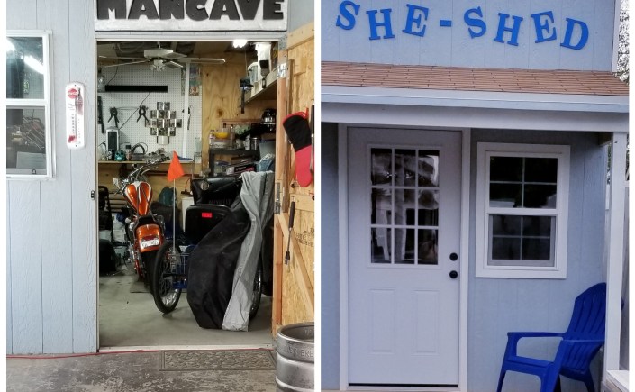 He has everything in it needed including a Frig and Kegerator. But it started to accumulate totes of stuff. Stuff we brought back from Illinois. Stuff from the Motor Home, Christmas Stuff and Craft stuff. So we decided this year to build a shed for my stuff. It started out as a regular shed for storage….But as we always seem to do, our imagination takes over.