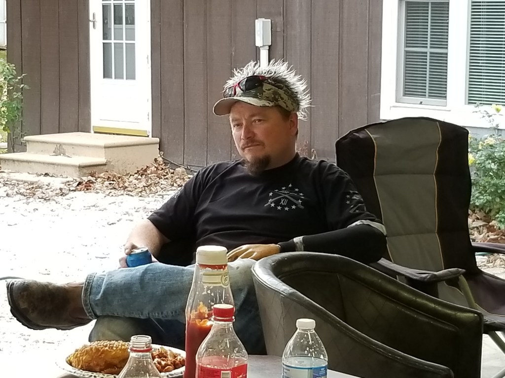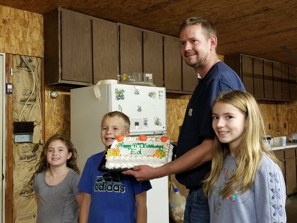 Cameron has found a home perfect for him. It was recently remodeled. It has 3 bedrooms, 1 down and 2 up. 2 living rooms, 1 could be closed off for winter if he would choose to, simply by closing the french doors and the other could be a dinning room. The garage is huge, 3 car I think, with a bathroom, 2 large garage doors and a wall of kitchen cabinets. It is like living in the woods at the edge of town. His job with Humpty Dump, driving and delivering dumpsters is only blocks away. He has come so far this past year. He continually keeps amazing us. Before we left, we celebrated Ed’s Birthday.”Happy 41st Birthday Ed” ……We had a cookout at Cameron’s. His garage is going to be quite handy for family gatherings.